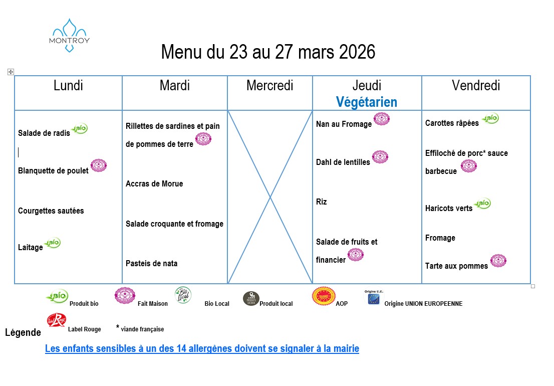 Menu du 23 au 27 Mars 2026