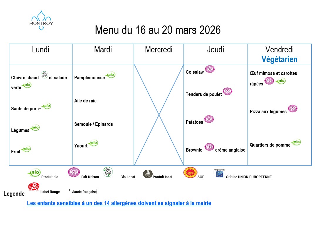 Menu du 16 au 20 mars 2026