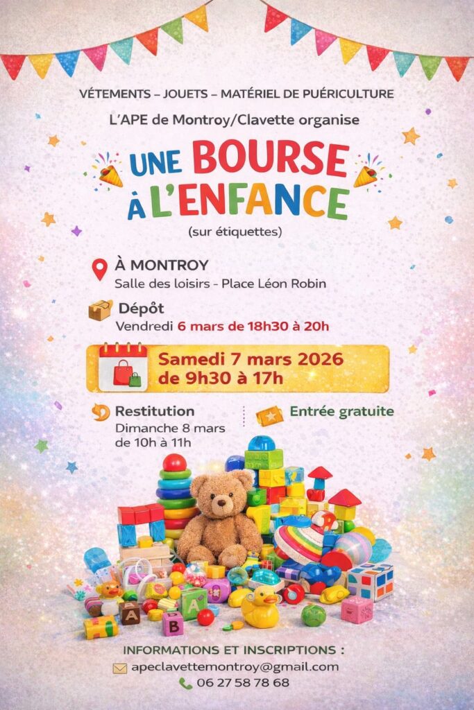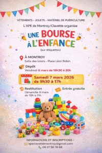 Bourse à l’Enfance L’APE organise une Bourse à l’Enfance Informations et Inscriptions : apeclavettemontroy@gmail.com Tel 06.27.58.78.68